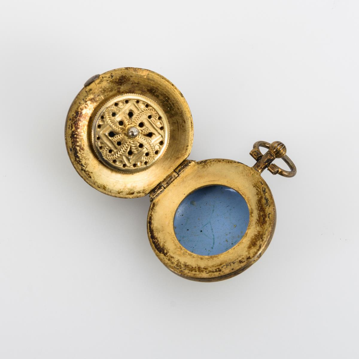 Vinaigrette als aufklappbarer Medaillonanhänger. Beidseitig farbig gemaltes Liebespaar in einer Landschaft. Innen einseitig ein kleines Landschaftsmotiv bzw. À-Jour-Binnendeckel für Riechstoffe. Kaum Alters-/Gebrauchsspuren.
