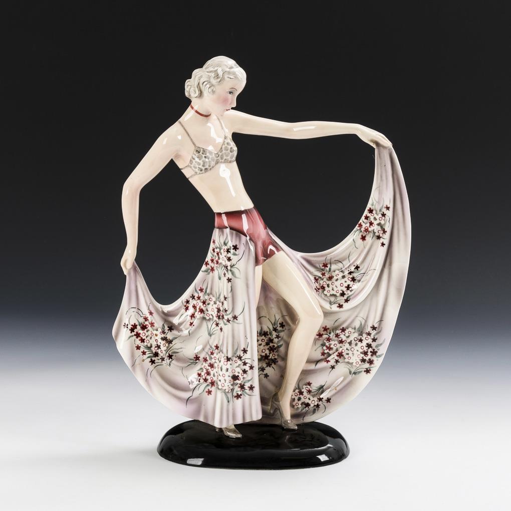 Tänzerin mit Bikini und zum Tanze gehaltenen Rock mit Blumenmuster, auf schwarzem Ovalsockel. Als Vorbild für diese Figur diente wohl die Schauspielerin Lida Baarova (eigentlich Ludmilla Babkova, 1914-2000), die in Deutschland durch ihren Film "Barcarole" (1935) und durch eine Liebesaffäre mit Joseph Goebbels Bekanntheit erlangte. Aufgrund letzterer wurde sie von Adolf Hitler 1938 wieder in die Tschechoslowakei ausgewiesen. Obwohl Baarova dunkles Haar hatte, gestaltete die Manufaktur die Figur mit hellen Haaren, da dies eher dem damaligen "deutschen Zeitgeschmack" zu entsprechen schien. Wohl retuschierter Brandriss am Hals, rechter Knöchel mit feinem Riss, linker Schuh mit Glasurriss, linker Finger mit kleinem Glasurchip.