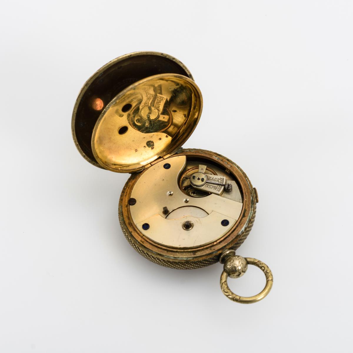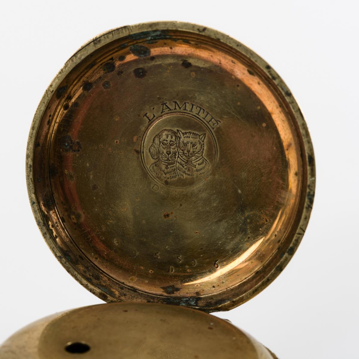 Gehäusenummer: 25506. Ungemarktes Vollplatinenwerk mit Zylinderhemmung, Reifenunruh und Schlüsselaufzug. Graviertes Zifferblatt mit römischen Stunden, Minuterie, gebläuten Zeigern und Chronographenanzeige mit seitlichem Schieber.