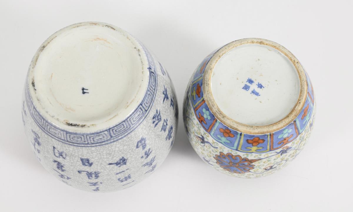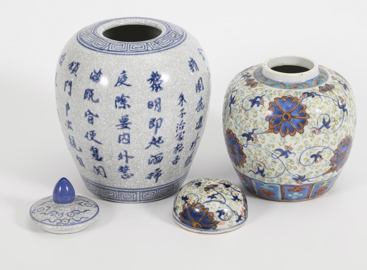 Kleinere Vase, gemarkt wohl Kangxi, mit sehr feinen Rankenmustern in Emailfarben und Unterglasurblau. Deckel mit alter Reparaturstelle eines Brandrisses. / Vase mit feinem Krakelee, Schriftzeichen und Musterung in Unterglasurblau.