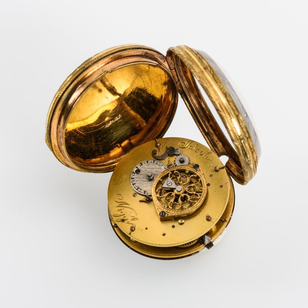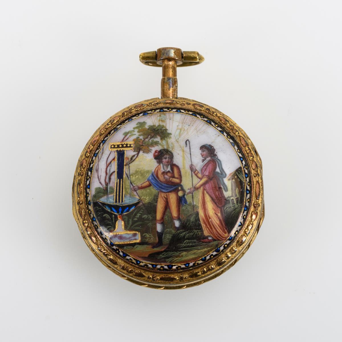 Gehäuse mit Reliefrand und farbigem Emailbild mit einem antikisierenden Paar an einem Brunnen. Läuft. Alters- und Gebrauchsspuren, Zifferblatt und Emailbild mit Defekten.