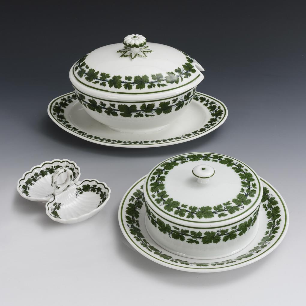 Käseglocke, Sauciere und Saliere mit Weinlaubdekor. Meissen.