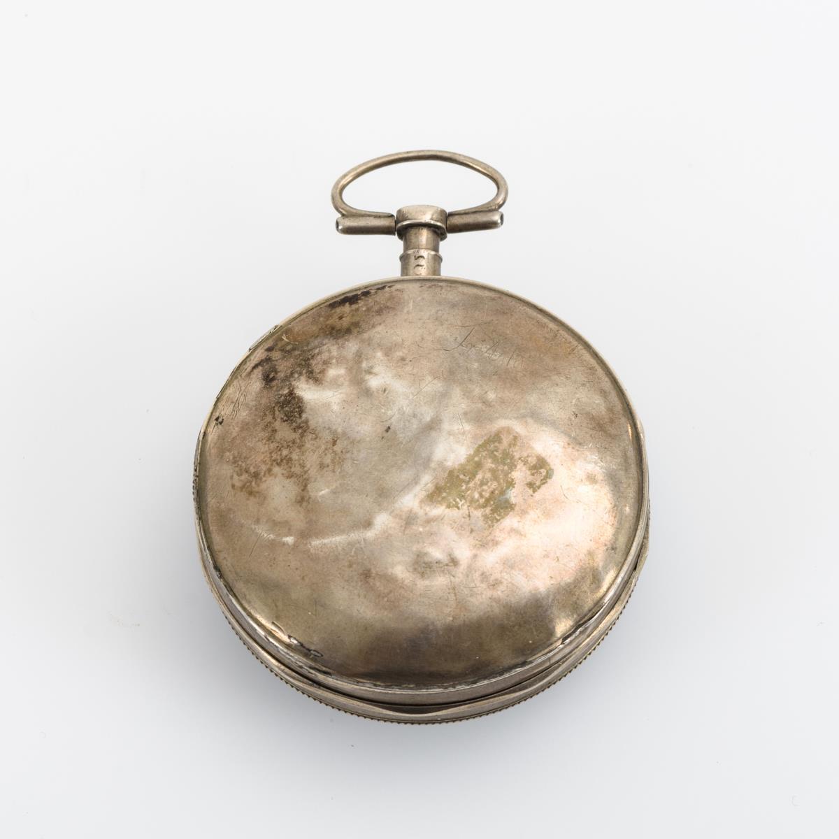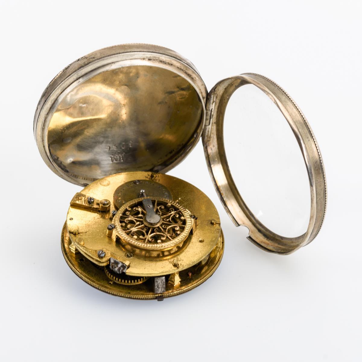 Versilberte Biedermeier-Taschenuhr mit blauem Emailzifferblatt.