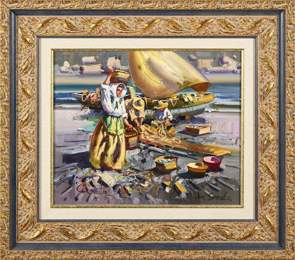 Die drei Fischer am Strand im hellen Sonnenschein beim Bearbeiten der Netze und beim Wegtragen des Fanges.