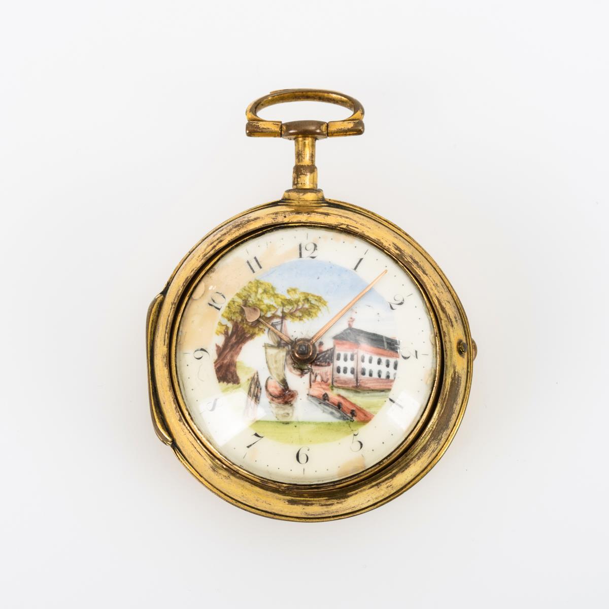 Englische Spindeltaschenuhr mit kleinem Landschaftsbild.