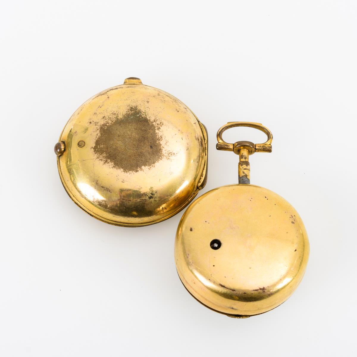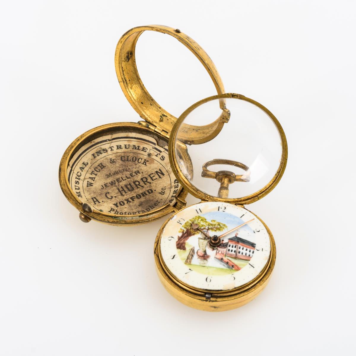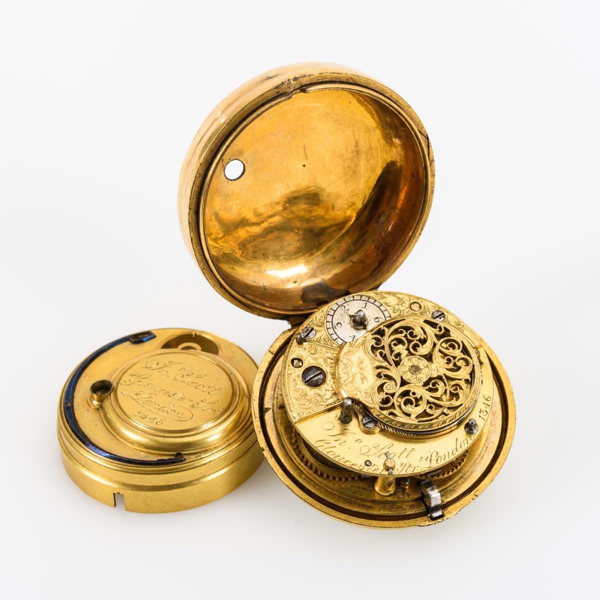 Werknummer: 1346. Graviertes Vollplatinenwerk mit floral durchbrochener Unruhbrücke, Spindelgang, Kette und Schnecke, Schlüsselaufzug. Herstellerprägung Werk: John Scott, Gloucester Str. London. Weißes Emailzifferblatt mit arabischen Zahlen, Minutenkranz, Spade-Zeigern und farbig gemalter Landschaft mit Architektur.