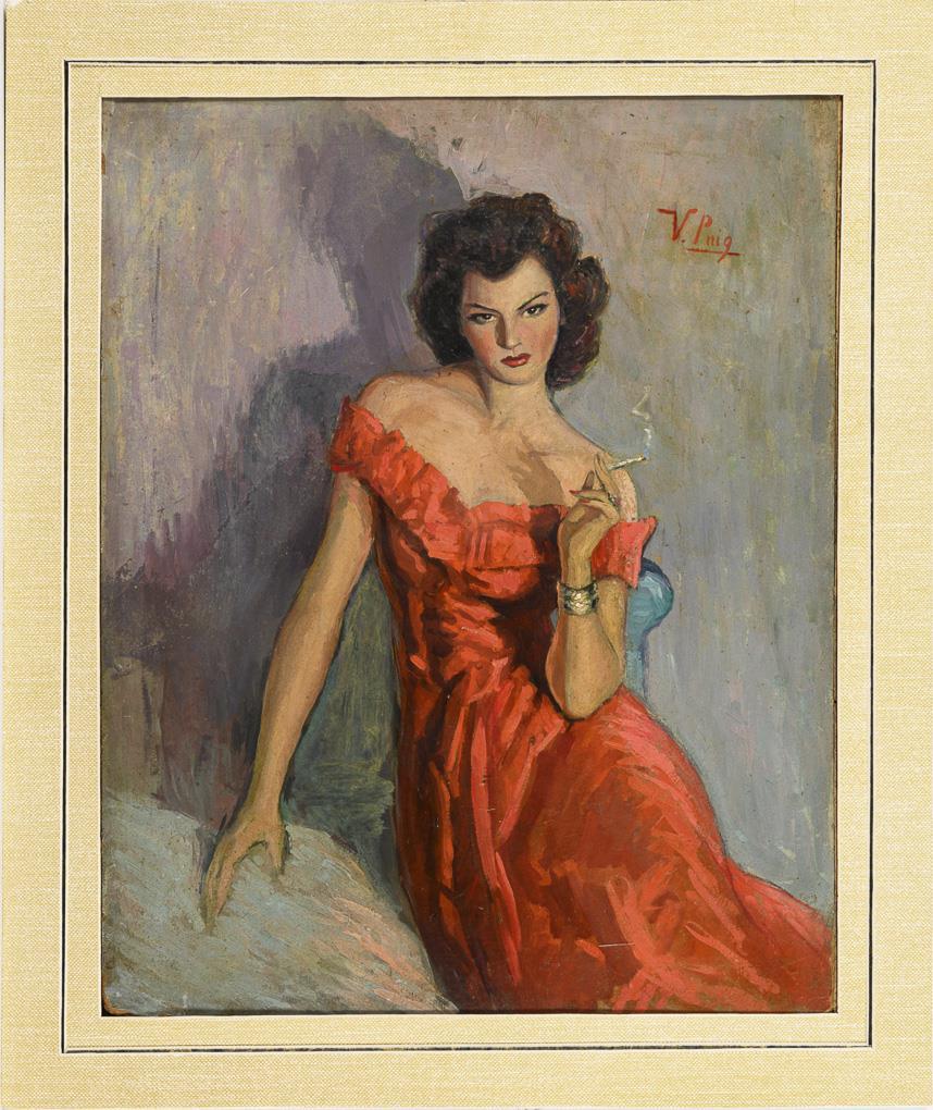 Bildnis einer jungen Frau im roten Kleid mit Zigarette und strengem Blick.
