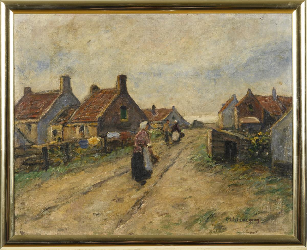 Die Fischersleute auf der Straße zwischen den Häusern unter wolkigem Himmel. Leichte Altersspuren.
