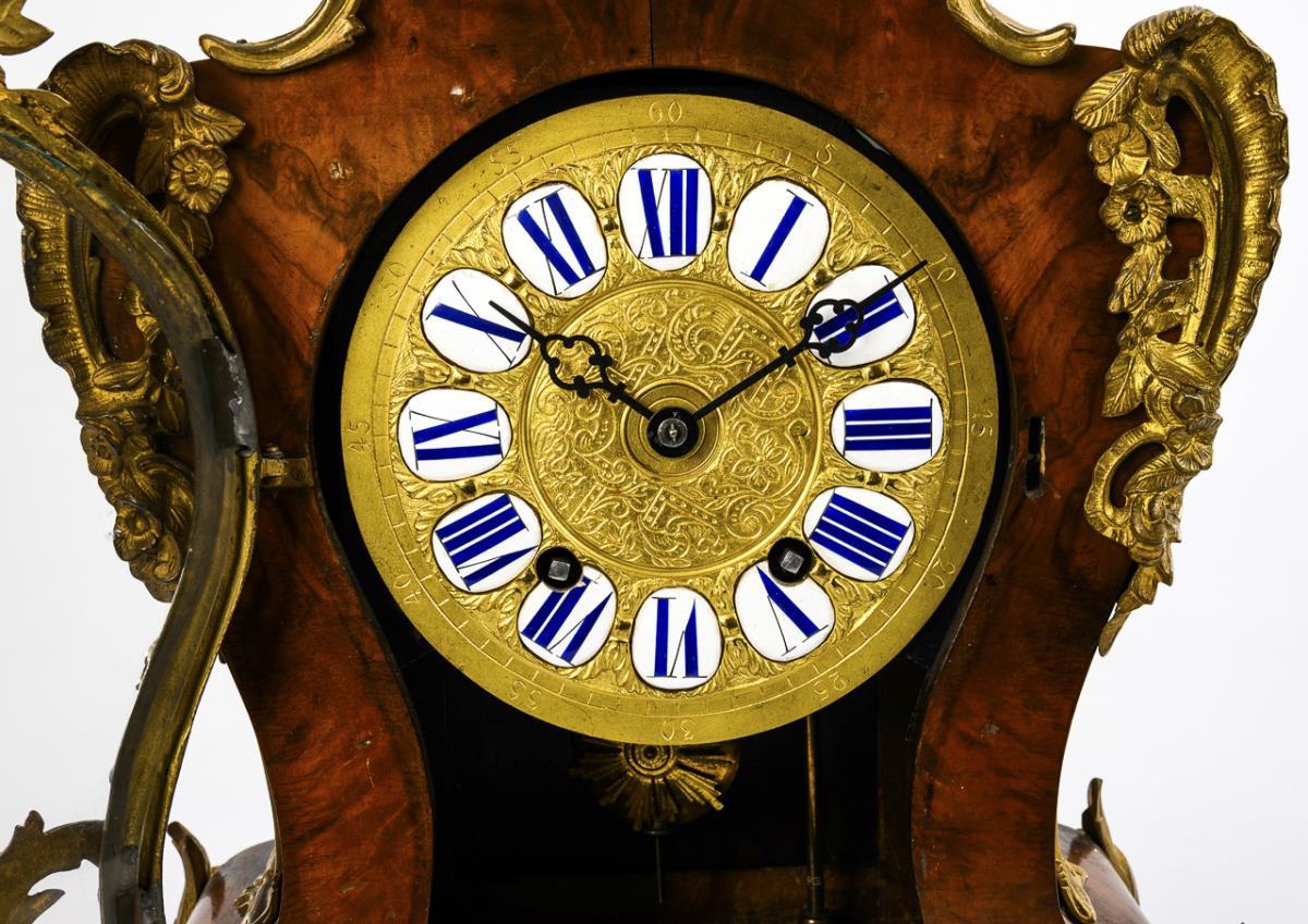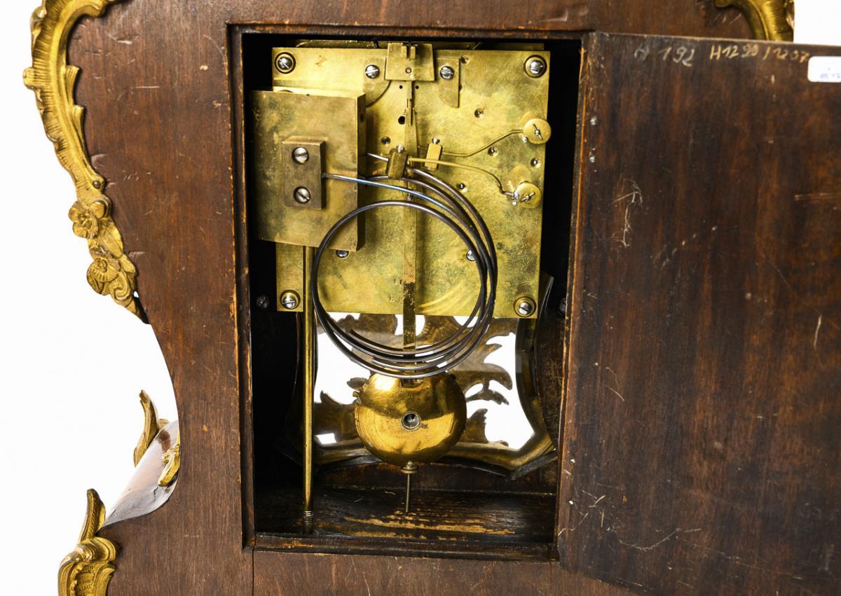 "B&B" gemarktes Werk mit Viertelstundenschlag auf 2 Tonfedern. Im Kurzzeittest funktionstüchtig. Reliefiertes Bronzeziffernblatt, weiße Emailkartuschen mit blauen, römischen Zahlen, Minutenkranz, Dreipasszeiger.