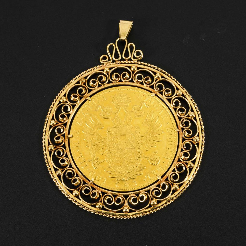 Großer Münzanhänger 4 Dukaten Österreich, in filigranem Rahmen.