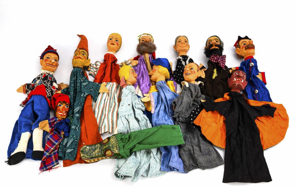 12 Figuren und 1 Krokodil mit handgeschnitzten Köpfen, teils nach Entwürfen von Theo Eggink (1901-1965). Altersspuren, kleine Defekte und Bestoßungen. Kasper mit stark defekter Kleidung.