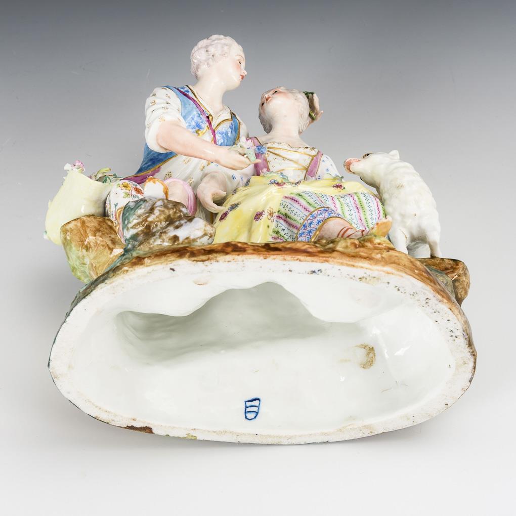Auf einem Felssockel sitzendes Schäferpaar mit Lamm. 1 Zeh bestoßen, linke Hand der Schäferin und des Schäfers restauriert, vereinzelte Bestoßungen an Blüten und Blättern.