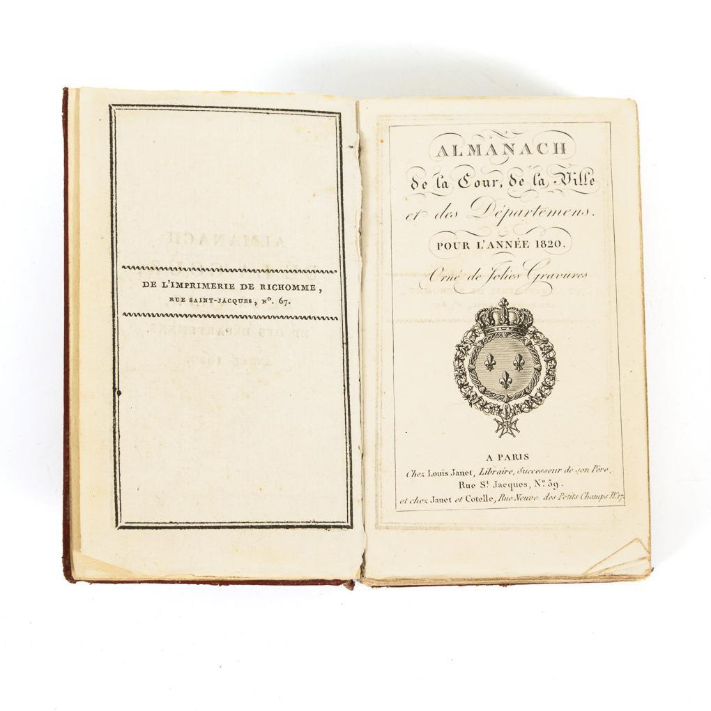 "Almanach de la cour, de la ville, et des departemens". Mit Kalendarium, Ranglisten und anderem mehr, sowie 4 Stichen. Im roten Einband mit Goldprägung und Goldschnitt, im Schuber. Gebrauchsspuren, Kanten teils bestoßen.
