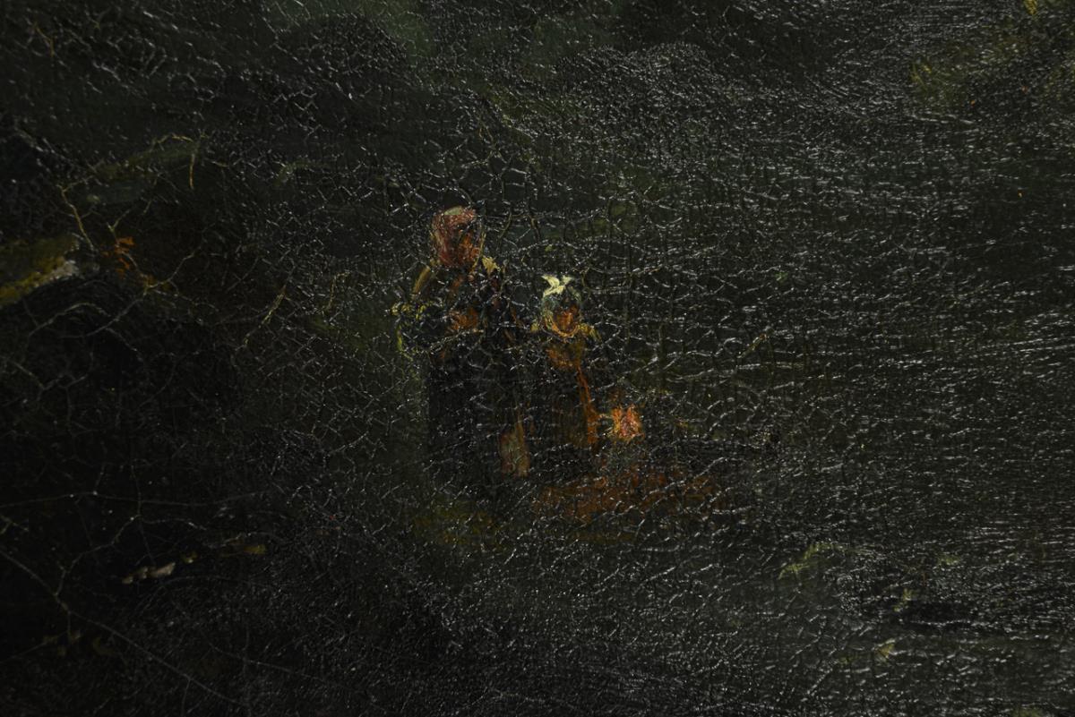 Helles Mondlicht über dem reißenden Gebirgsfluss mit den beiden Figuren auf dem Weg vor der hell erleuchteten weiten Berglandschaft. Altersspuren.