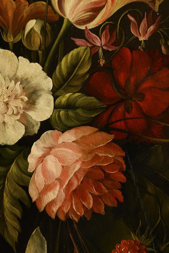 Blumenstrauß im Altmeisterstil mit verschiedenen Blumen und Himbeeren in Glasvase. Minimale Altersspuren.