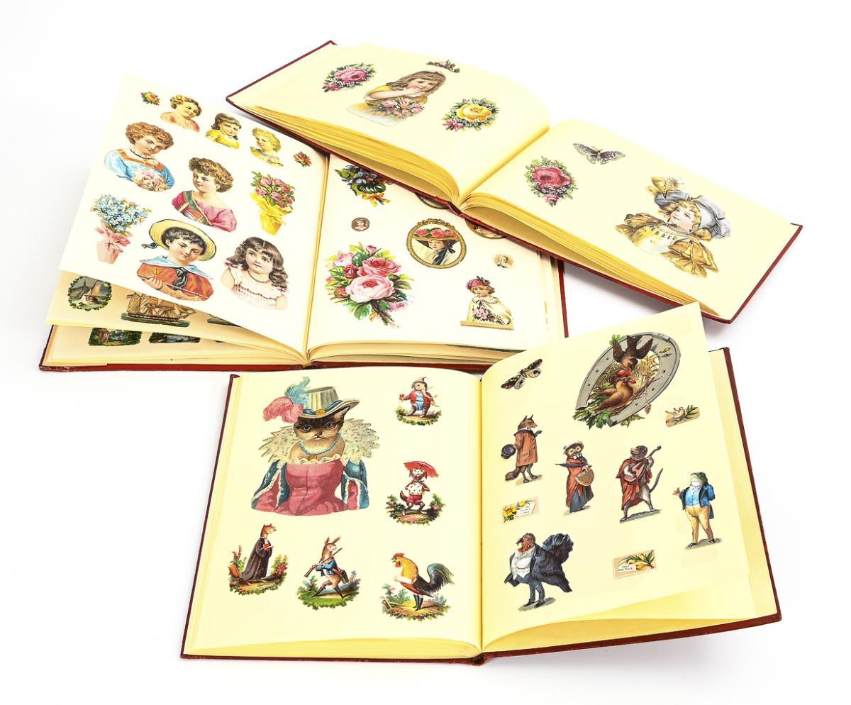 Alben mit Goldprägung und integrierter Oblate. Eingeklebte Luxuspapiere: Blumen, Kinder, Trachten, Tiere (teils als Karikatur), Schiffe, Kutschen, Weihnachten, Ostern, Märchen usw. Einige leichte Alters-/Gebrauchsspuren an den Alben.