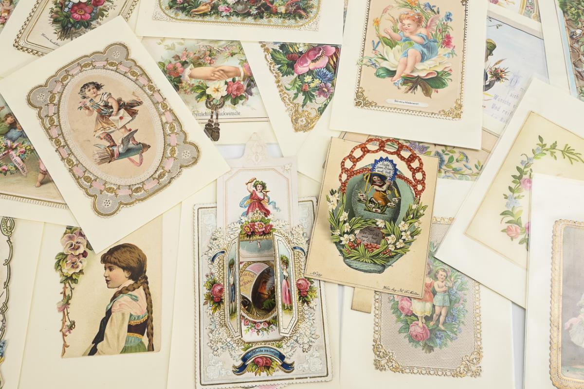 Im braunen Halbledereinband eingeklebte Farblithografien (Blumen, Kinder, Früchte, Tiere, Kutschen, asiatische Motive, Trachten, Märchen). Lose Oblaten zumeist Glückwunschkarten, Blumen und kindlichen Szenen. 1 sich aufklappendes Ziehbillett (H F Müller Wien), 1 Ziehbillett mit Tür sowie drehbare Lebensalter mit Sprüchen. Teils beschriftet (vereinzelt französisch, englisch bzw. tschechisch). Album mit einigen Alters-/Gebrauchsspuren.