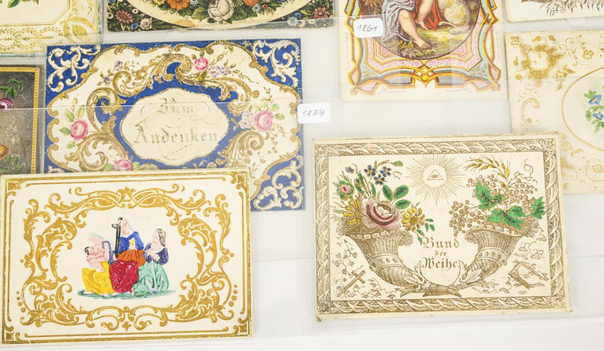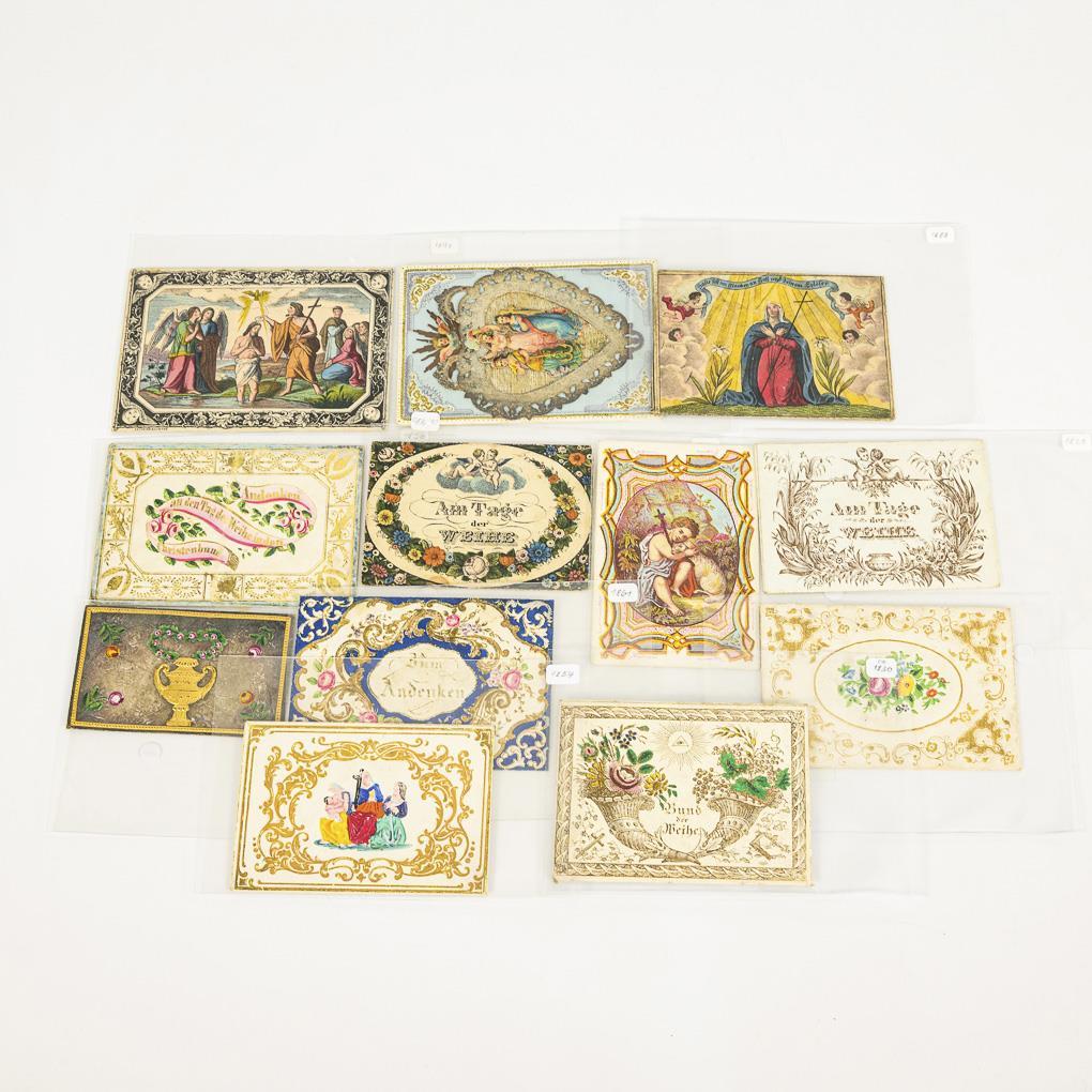 Farblithografien, Golddruck teils bemalt, geprägtes Papier bemalt, Stanzpapier, kolorierter Kupferstich und Holzstich. Maximal 8 x 12 cm.