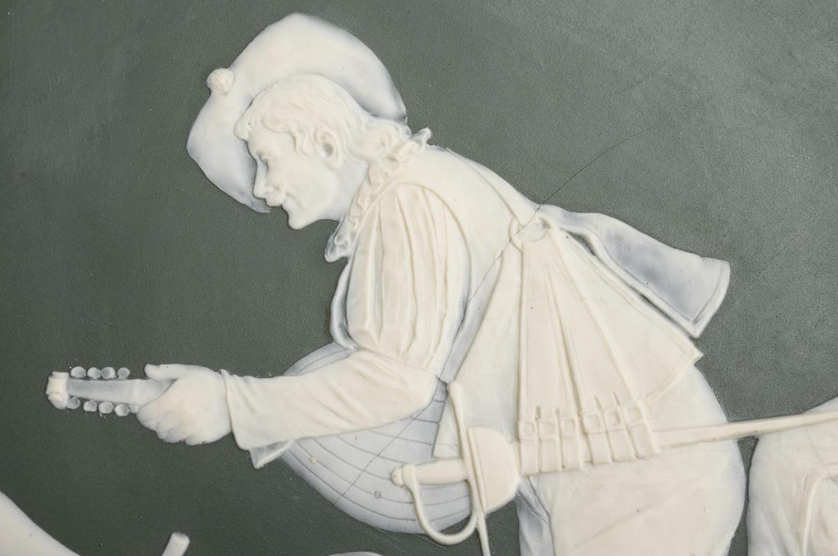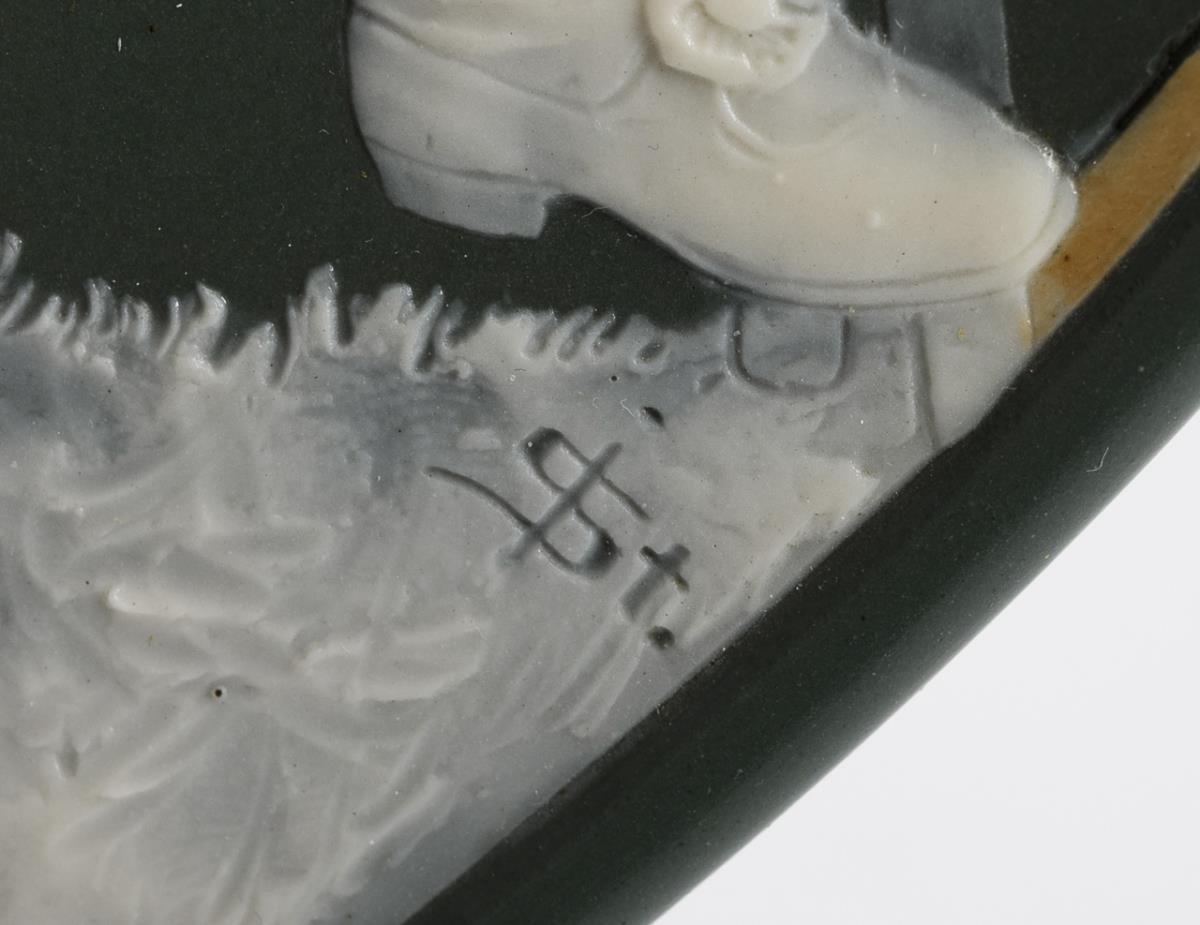 Steinzeug, mattgrüner Fond, durchscheinend weiße Figurenreliefs in Art der Pâte-sur-pâte-Malerei und der Wedgwood-Ware, floraler Chromolithdekor. Ø 45 cm.