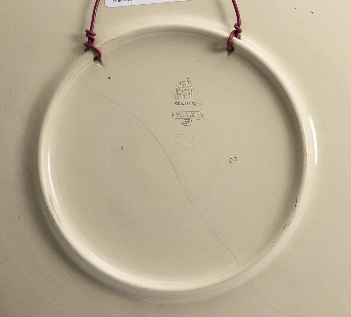 Jugendstil-Wandteller mit Figurenszene beim Liebesständchen im Stil der Renaissance, gerahmt von bunten Blumen. Drahtaufhängung. Wandungsriss, Haarrisse im Phanolith.