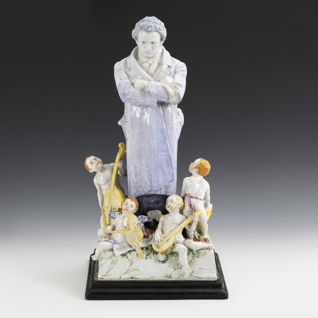 Auf einem Rechtecksockel stehender Beethoven mit verschränkten Armen, zu seinen Füßen 4 musizierende Putten. Ebonisierter Sockelrahmen. Teils rissig, geklebte Stellen, Glasurdefekte und -bestoßungen.