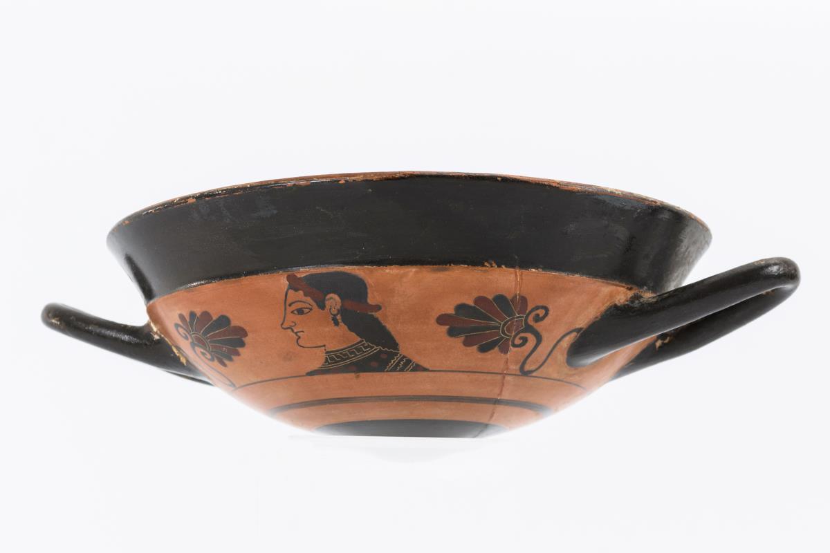 Altgriechisches Trinkgefäß in Form einer flachen Rundschale mit 2 Henkeln. Restauriert, teils berieben.