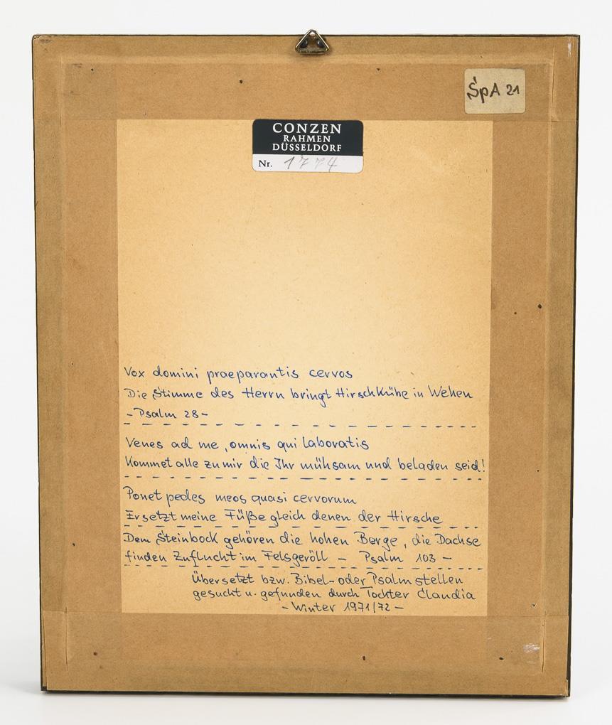 Darstellung einer Hirschjagd im bewaldeten Gebirge mit Erscheinung Christi im Himmel sowie im Bild integrierte goldfarbene lateinische Bibelzitate. Starke Alters-/Gebrauchsspuren, Knickspuren, kleine Fehlstellen am Rand.