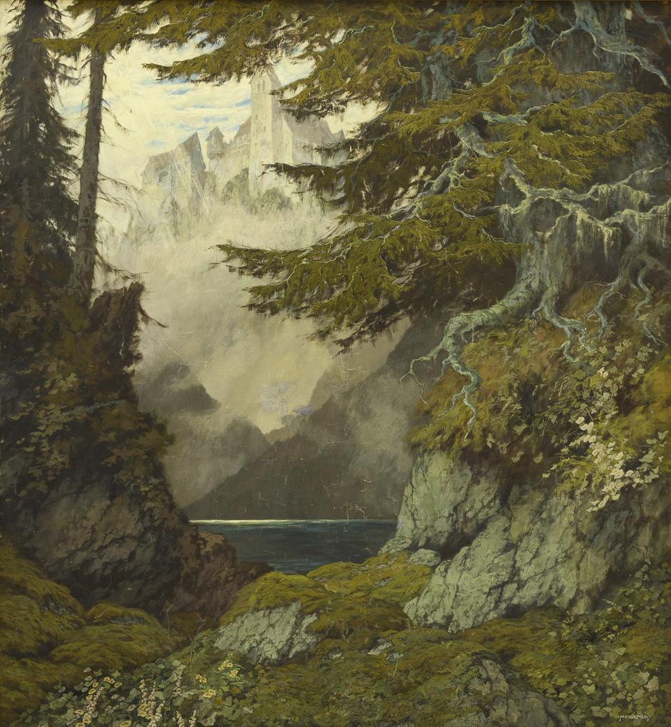 Großes Hauptwerk mit Blick durch dicht stehende Tannen und steile Felsen über einen See zum Gipfel mit Burg am Horizont. Leichte Kratzer.