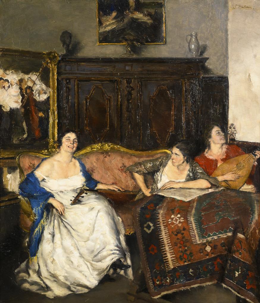Drei Frauen in ausgelassener Stimmung mit Lauten auf einem Sofa vor einem Schrank mit Gemälde. Anbei und abgebildet in Burger, Willy: Péter Kálmán. Drei Eulen-Künstlerbücher Band IV. München.