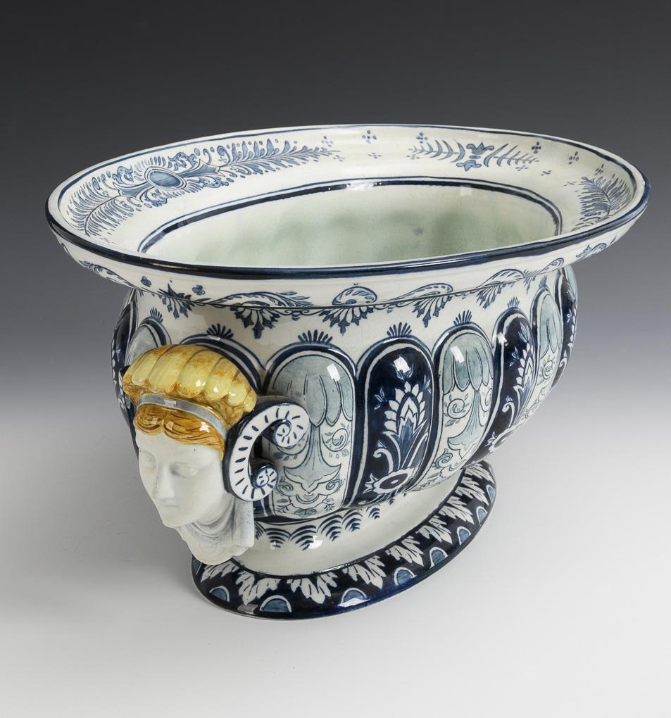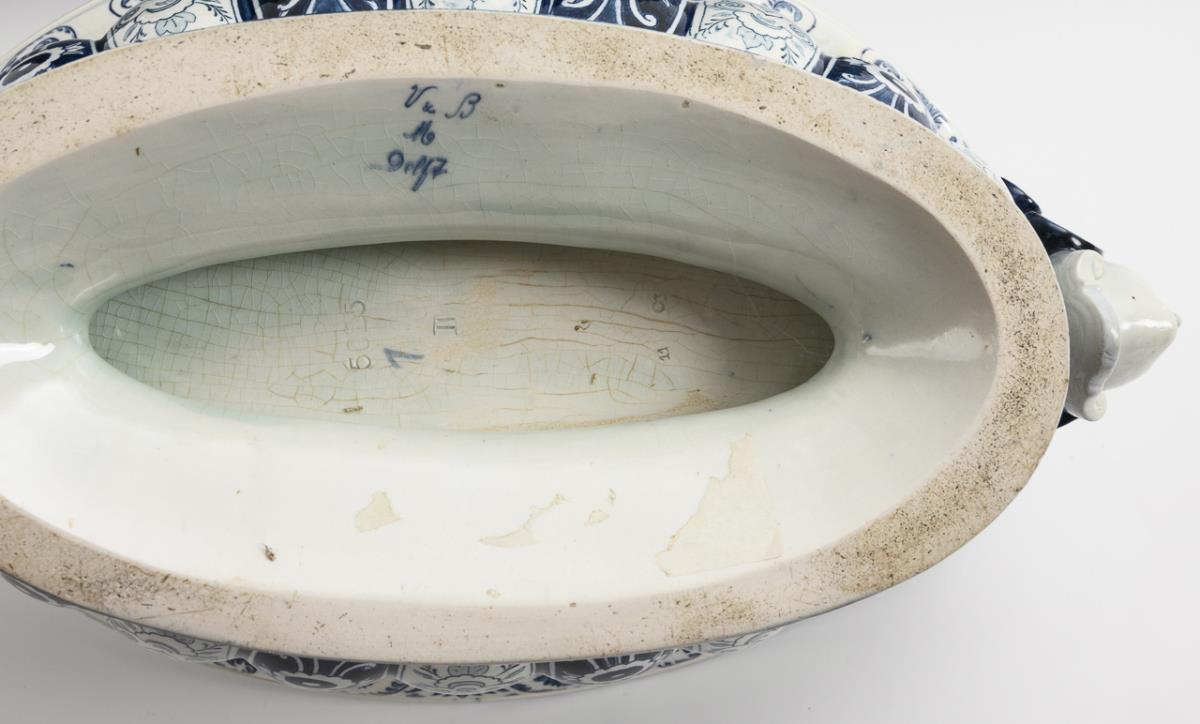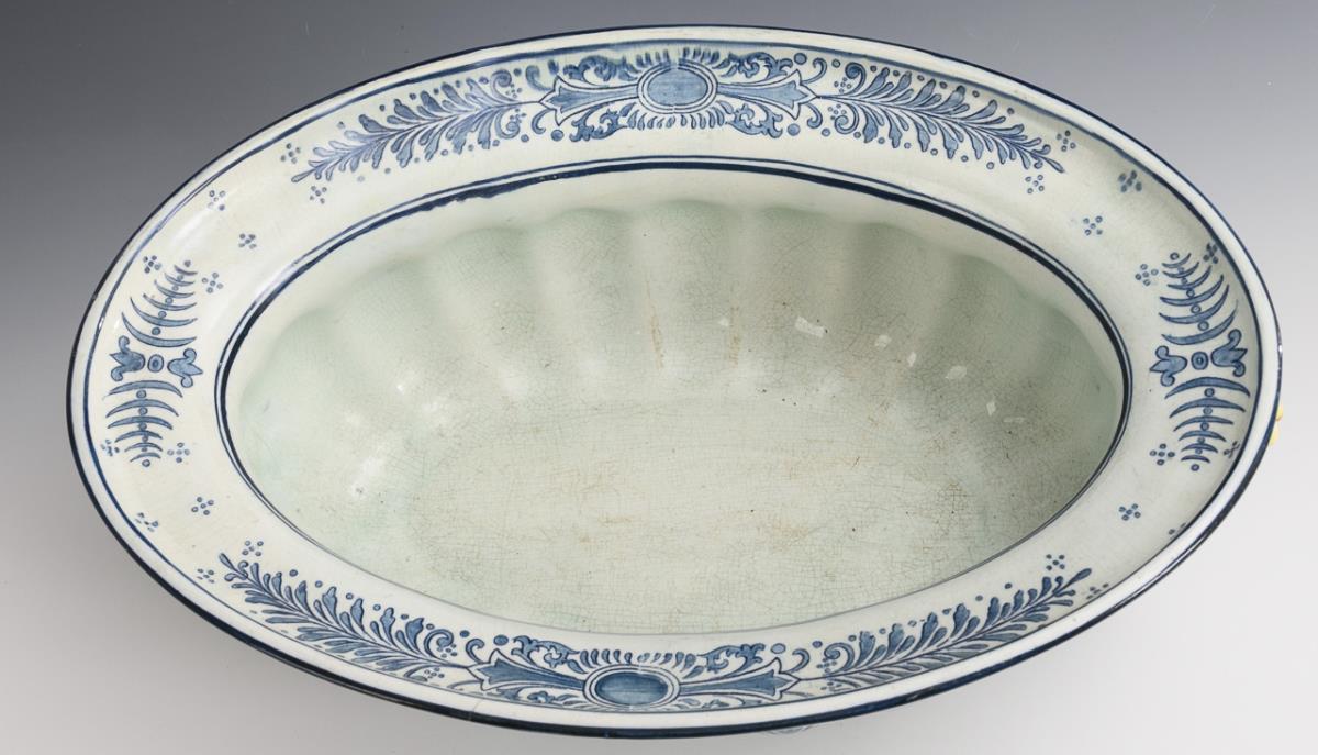 Fayence, weiß glasiert, kobaltblauer floraler Umdruckdekor, teils gelb und braun staffiert. L 42,5 cm.