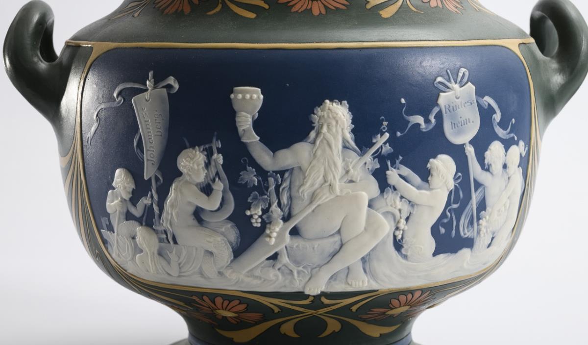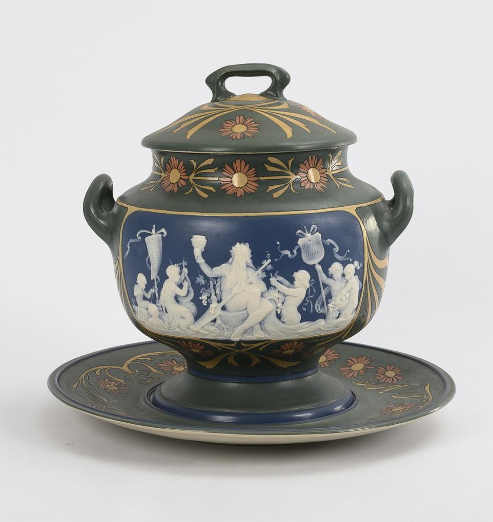 Steinzeug in Grün, Blau und Elfenbein, durchscheinend weiße Figurenreliefs in Art der Pâte-sur-pâte-Malerei und der Wedgwood-Ware, floraler Chromolithdekor. Bowle H 36 cm, Teller Ø 42,5 cm.