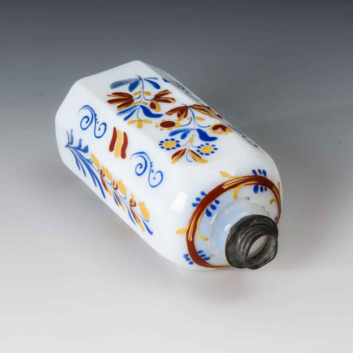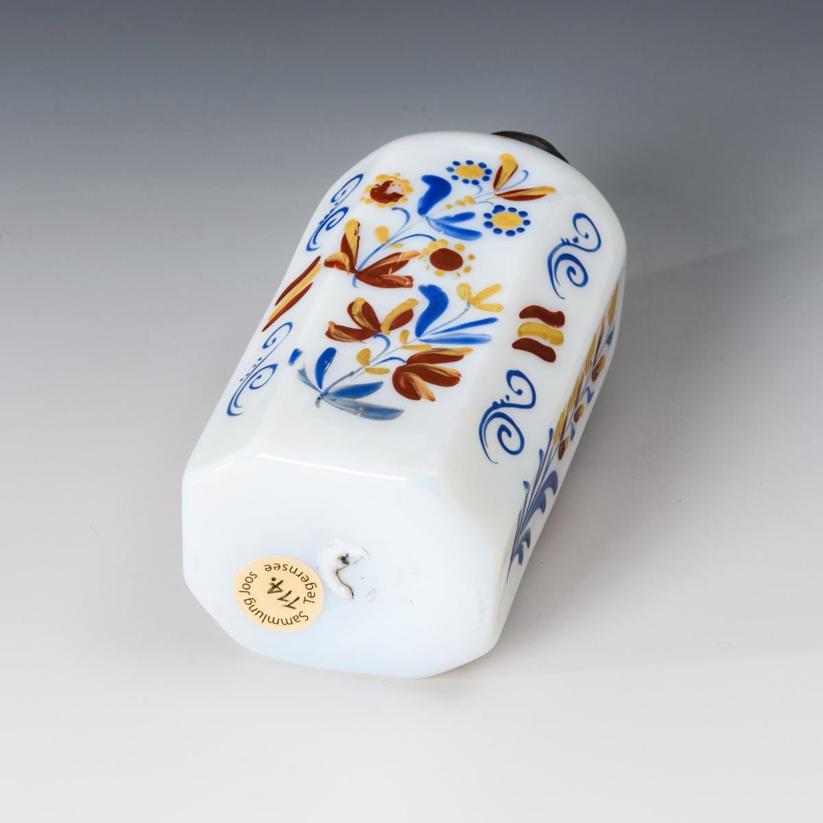 Opalisierendes Milchglas, polychrome Emailmalerei, Zinn-Schraubverschluss, Abriss. H 14,5 cm.