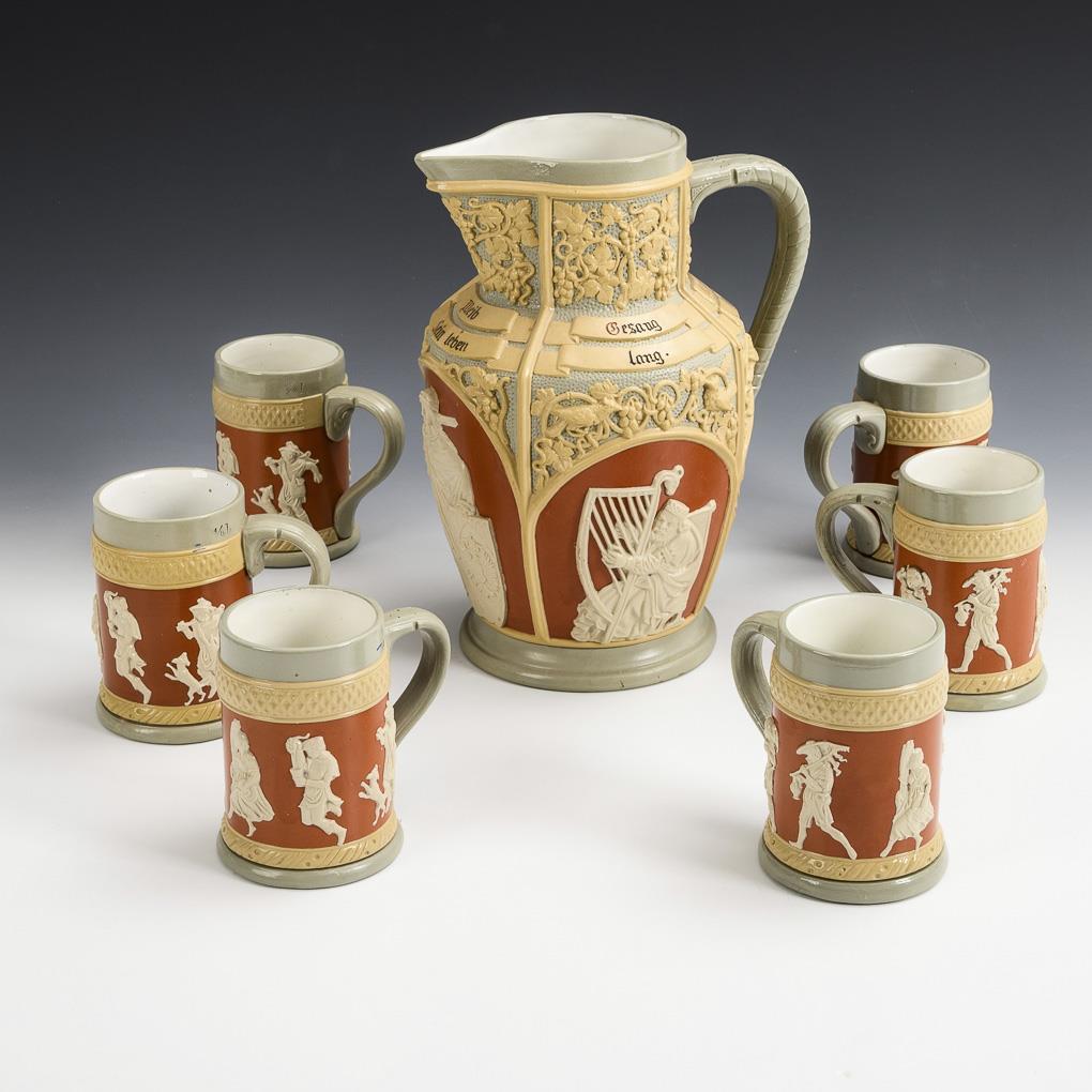 Historismus-Reliefkanne mit Weinrebendekor und Figurennischen, darüber ein Trinkspruch "Wer nicht liebt Wein, Weib, Gesang, der bleibt ein Narr sein Leben lang". Krüge mit umlaufendem Figurenfries ausgelassen feiernder Ständefiguren.