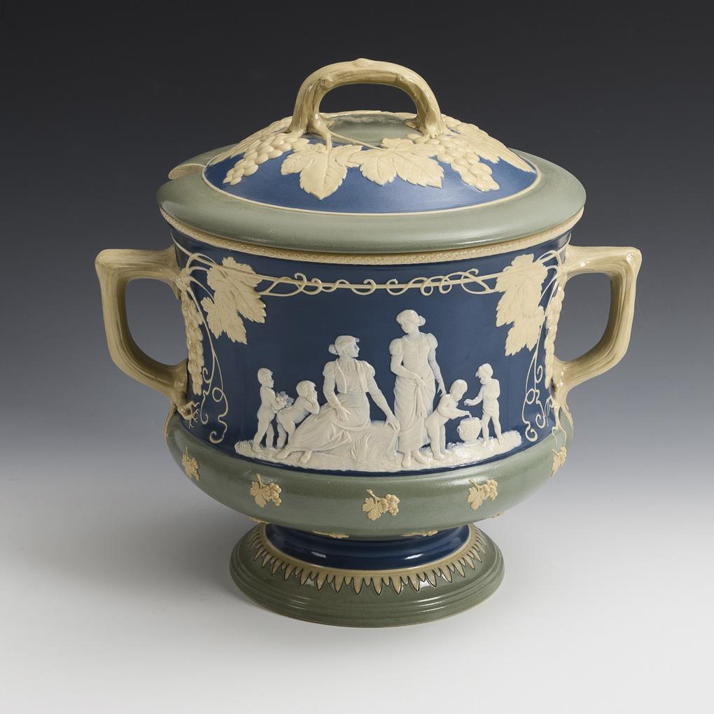 Zylindergefäß mit 2 Asthenkeln und Deckel mit Astgriff. Umlaufender Wandungsfries mit Figurengruppen und Weintraubendekor. Altersspuren, Wandung und Phanolith haarrissig, im Deckel restauriert.