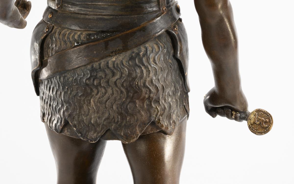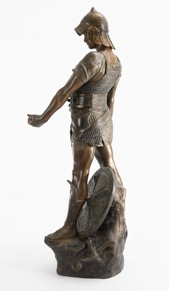 Stehender, römischer Krieger in Rüstung mit Rundschild, Schwert und Axt als Allegorie des Krieges, am Natursockel bezeichnet "La Guerre". Mit Defekten, Fehlstellen, ergänzter lose Schwertklinge aus Holz, Schwertgriff geklebt, Bereibungen, kleinen Bestoßungen.