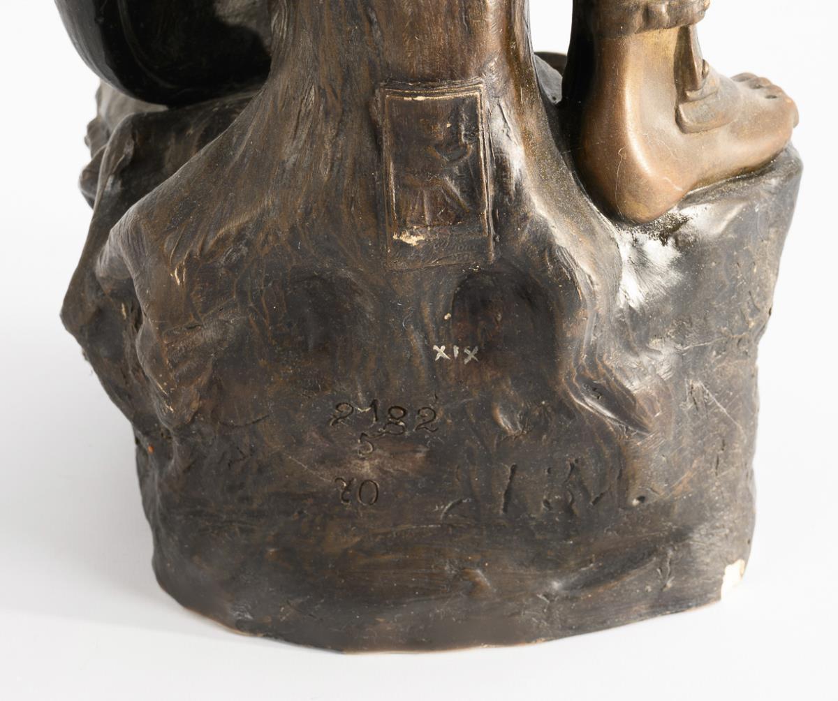 Gips, bronzefarbene Mattglasur in Brauntönen, teils goldstaffiert. H 76,5 cm.