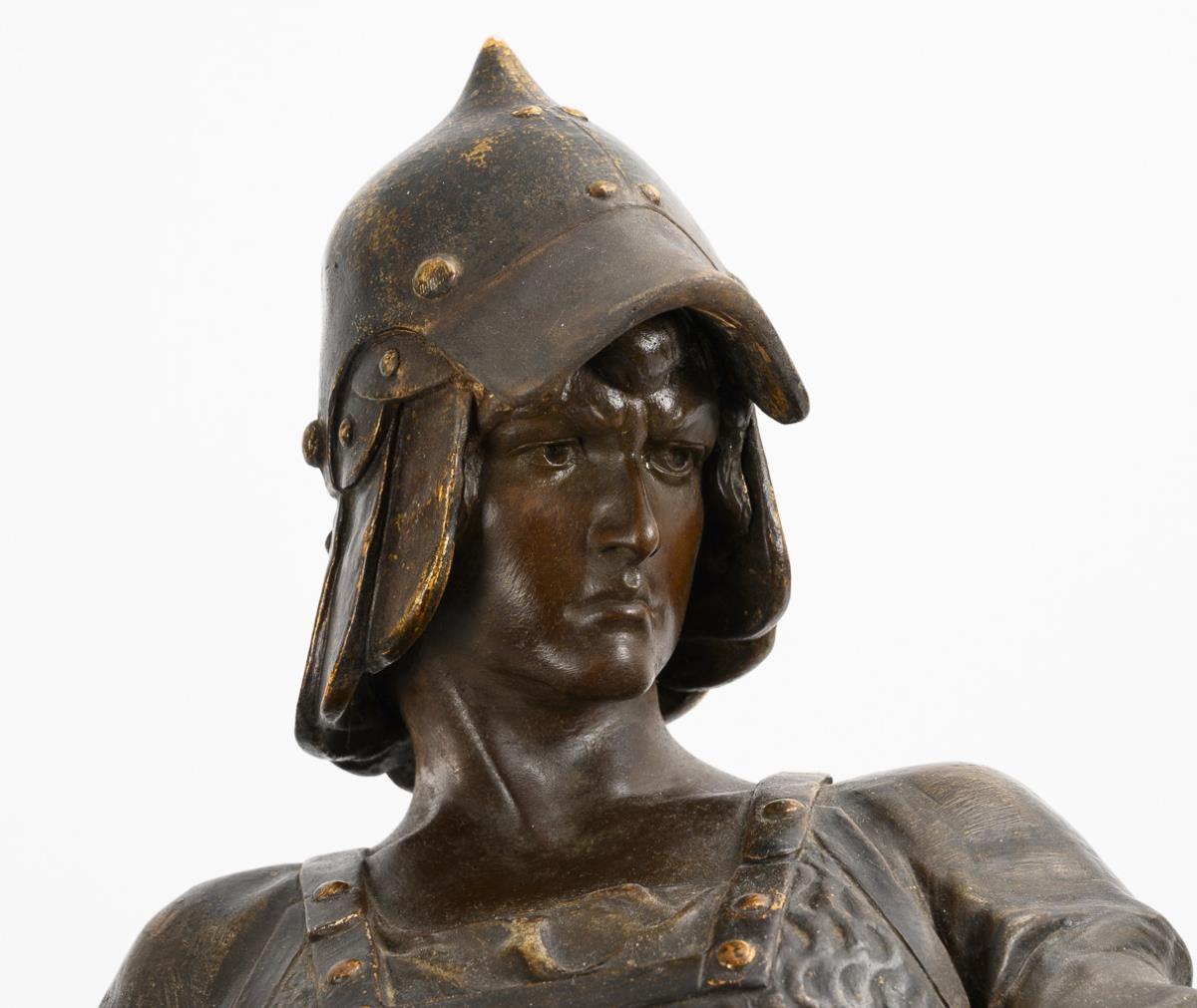 Stehender, römischer Krieger in Rüstung mit Rundschild, Schwert und Axt als Allegorie des Krieges, am Natursockel bezeichnet "La Guerre". Mit Defekten, Fehlstellen, ergänzter lose Schwertklinge aus Holz, Schwertgriff geklebt, Bereibungen, kleinen Bestoßungen.