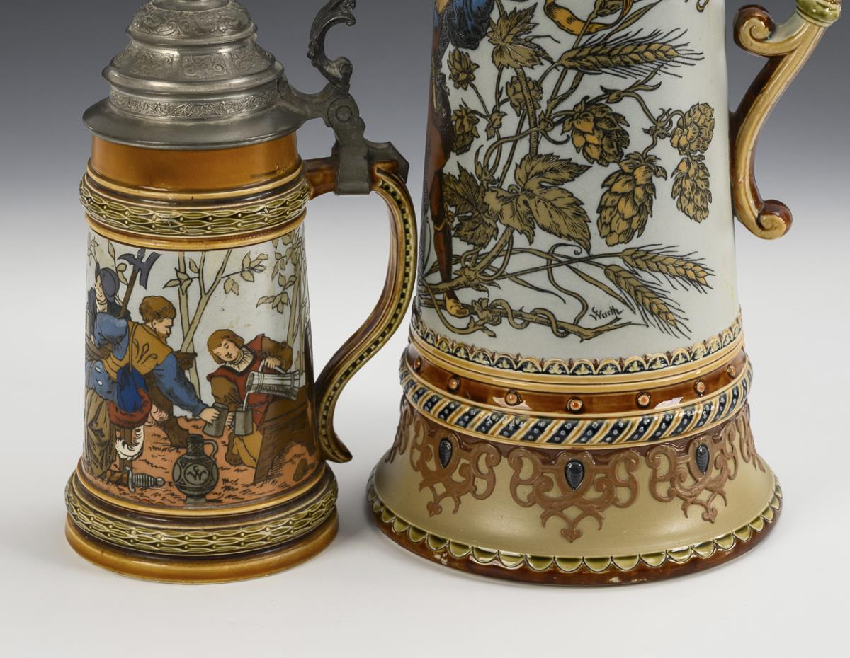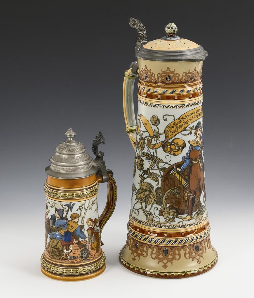 Reliefkrüge mit historistischem Dekor, schauseitig trinkende Herren und Hopfendekor, 1x mit Spruchband. 1x mit Fasson-Zinndeckel, 1x mit Steinzeug-Deckel und gravierter Zinnmontierung "Fredrick Hugo Schau May 20-1906". Kleiner Krug rissig und restauriert, großer Krug mit geklebtem Deckel.