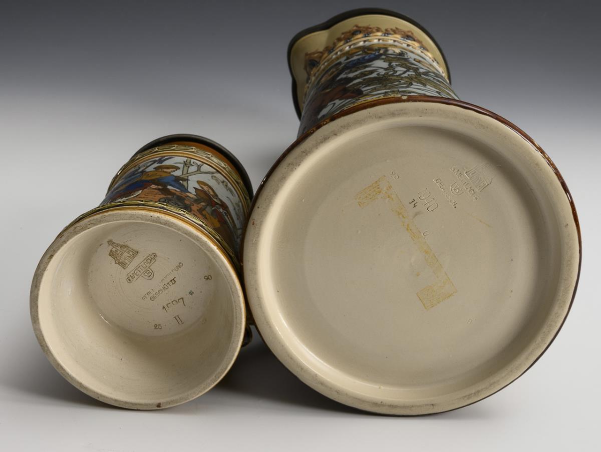 Geprägte Turmmarke "Mettlach" mit Zusatz "Ges. gesch." und "Gegen Nachbildung geschützt", ab 1887. Ende 19. Jh. Bezeichnet "C Warth" und monogrammiert "CW". Entwurf: Georg Christian WARTH (1836-1890). Modell-Nr. 1597 und 1940.