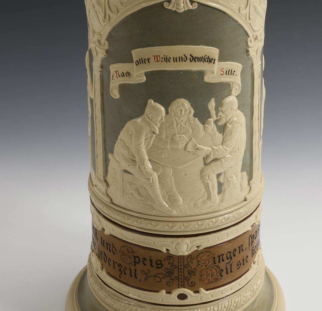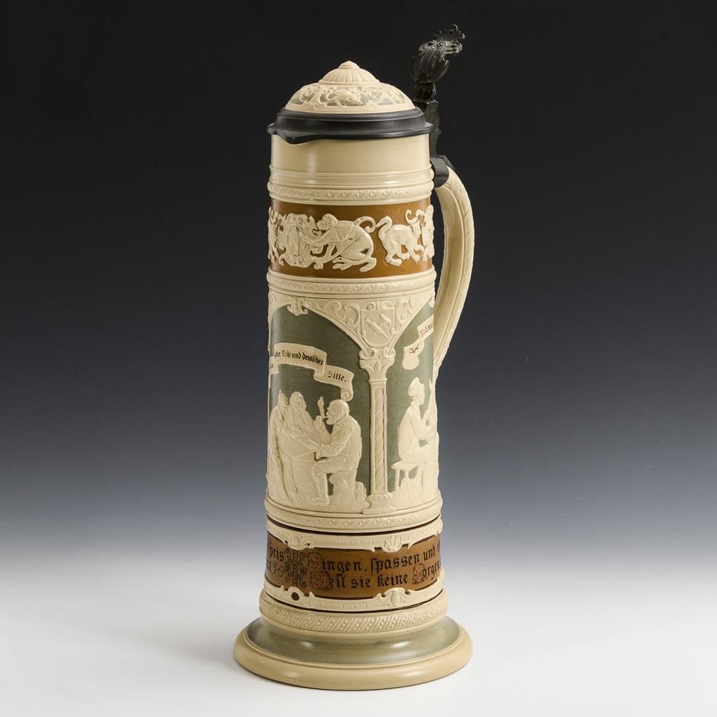 Konischer Zylinderkrug mit profiliertem Henkel und historistischem Dekor, 3 Bogennischen mit trinkenden Herren und Spruchbändern, rahmende Friese mit Tieren, Wappenschildern und Kartuschen mit Trinksprüchen. Steinzeug-Deckel mit Zinnmontierung und Schilddrücker.
