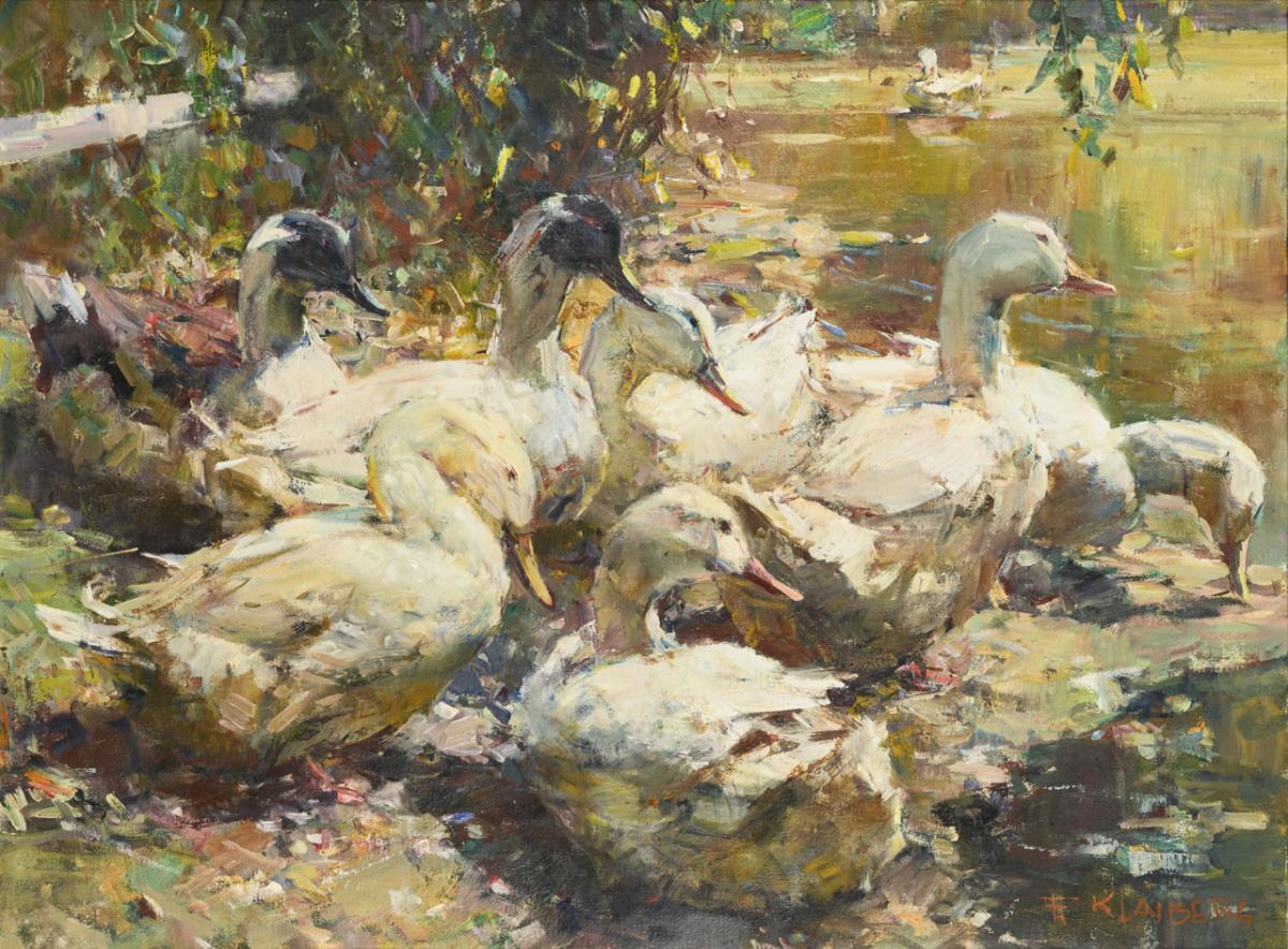 Viele weiße Enten im Sonnenschein am Ufer eines Sees. Anbei Echtheitszertifikat des Künstlers.