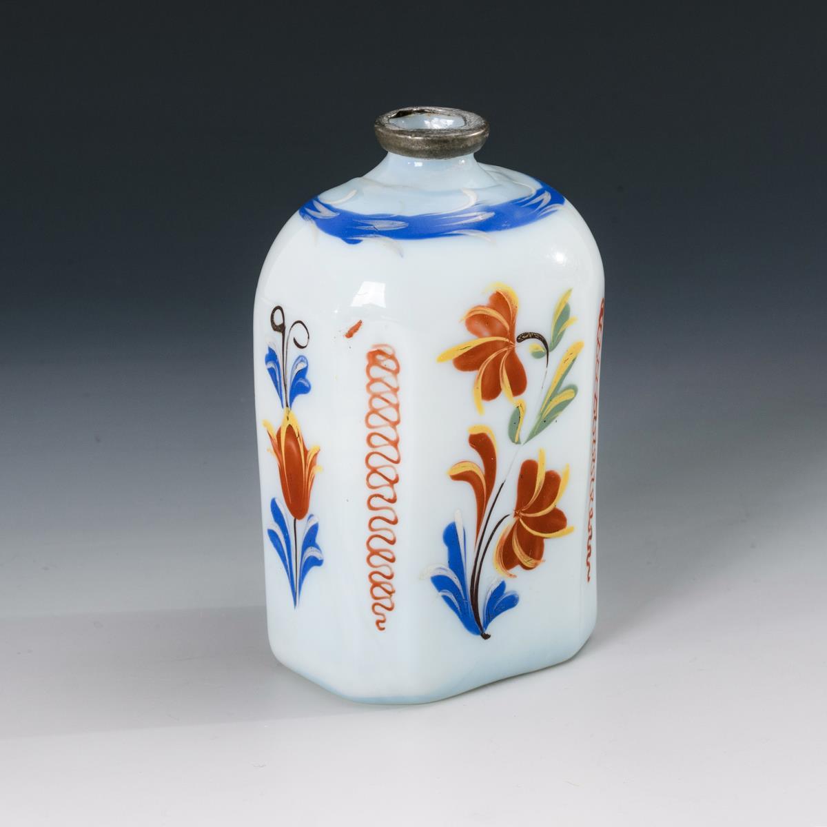 Opalisierendes Milchglas, polychrome Emailmalerei, Zinnmontierung, Abriss. H 13 cm.