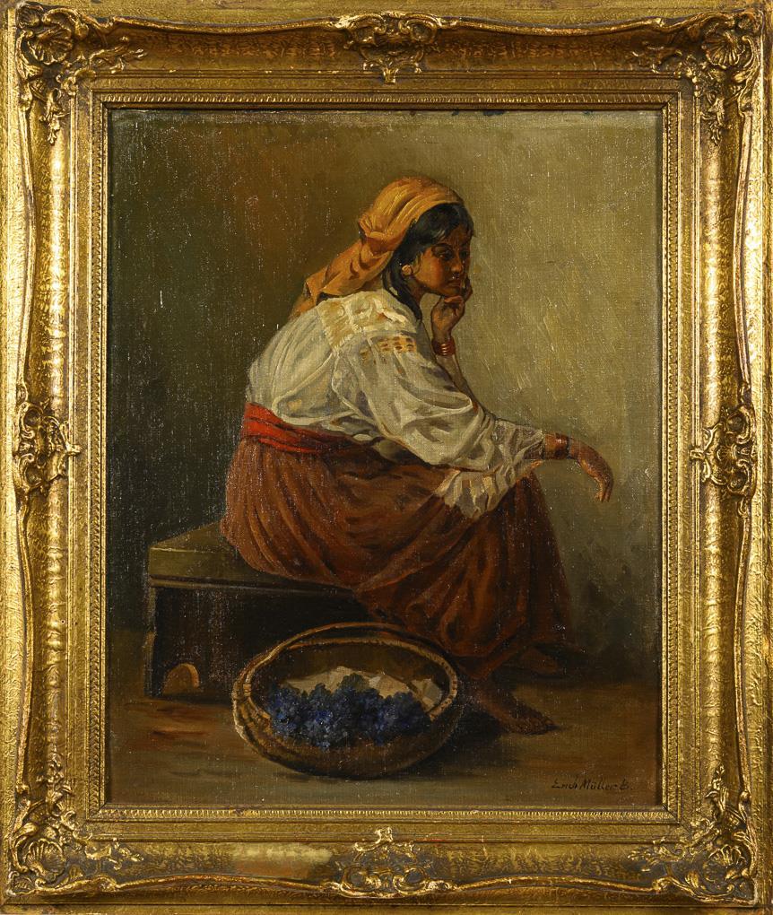 Sitzende junge Frau in südländischer Kleidung mit einem Korb voll Trauben. Leichte Altersspuren.
