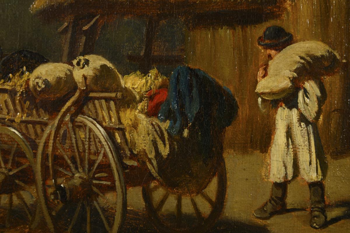 Bauer bei Beladen des Karren vor dem Hof mit dem Geflügel.