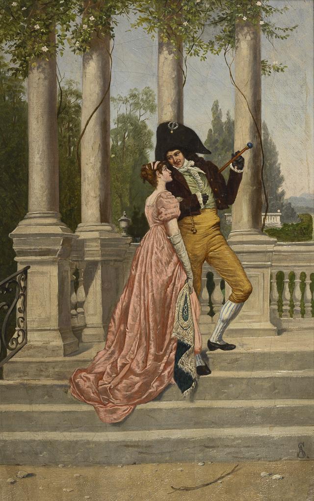 Junges Paar in herrschaftlicher Kleidung um 1800 auf einer Terrasse mit Säulen bei hellem Sonnenschein. Restauriert.