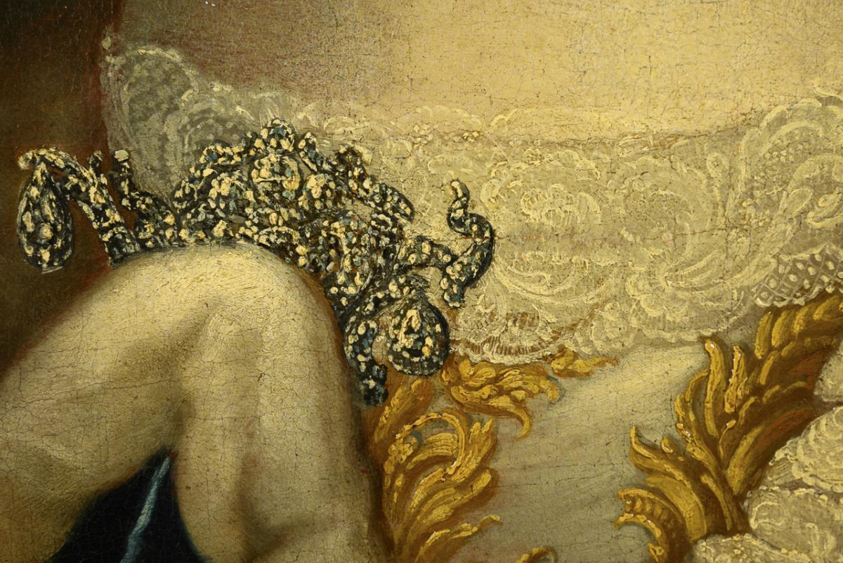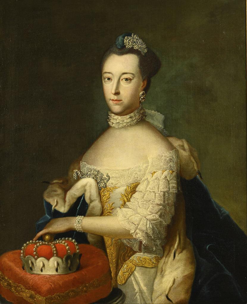 Porträt der Markgräfin von Brandenburg-Ansbach und Bayreuth (1735-1791) im hellen Kleid mit blauem Hermelinmantel. Leinwand doubliert.