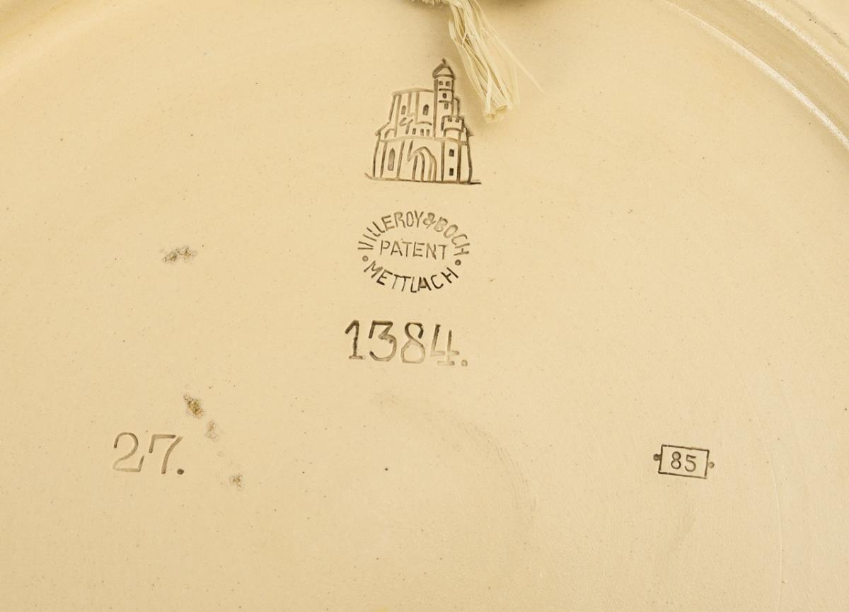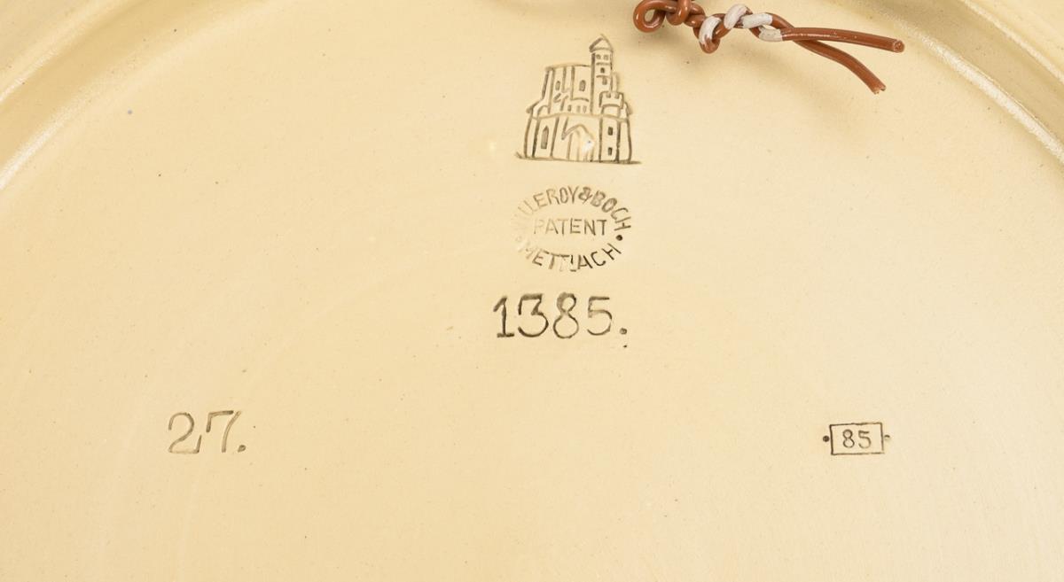 Geprägte Turmmarke mit Zusatz "Villeroy & Boch Patent Mettlach", ab 1887. Monogrammiert "WS". Modell-Nr. 1384 und 1385.