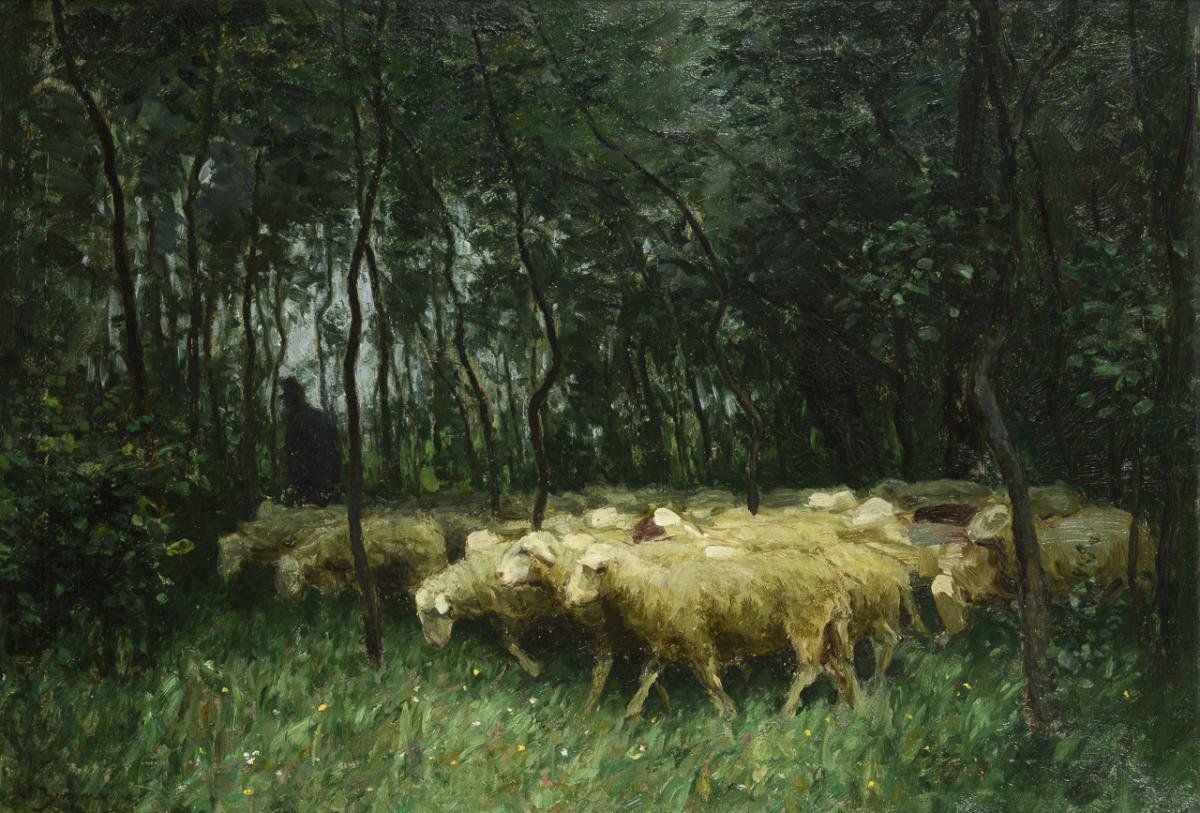 Die Tiere mit dem Schäfer im Schatten junger Bäume. Minimale Altersspuren.
