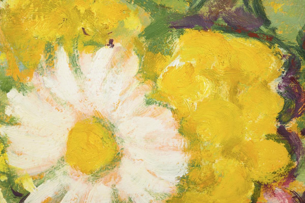 Großer Blumenstrauß in leuchtenden Farben in einer Kanne.