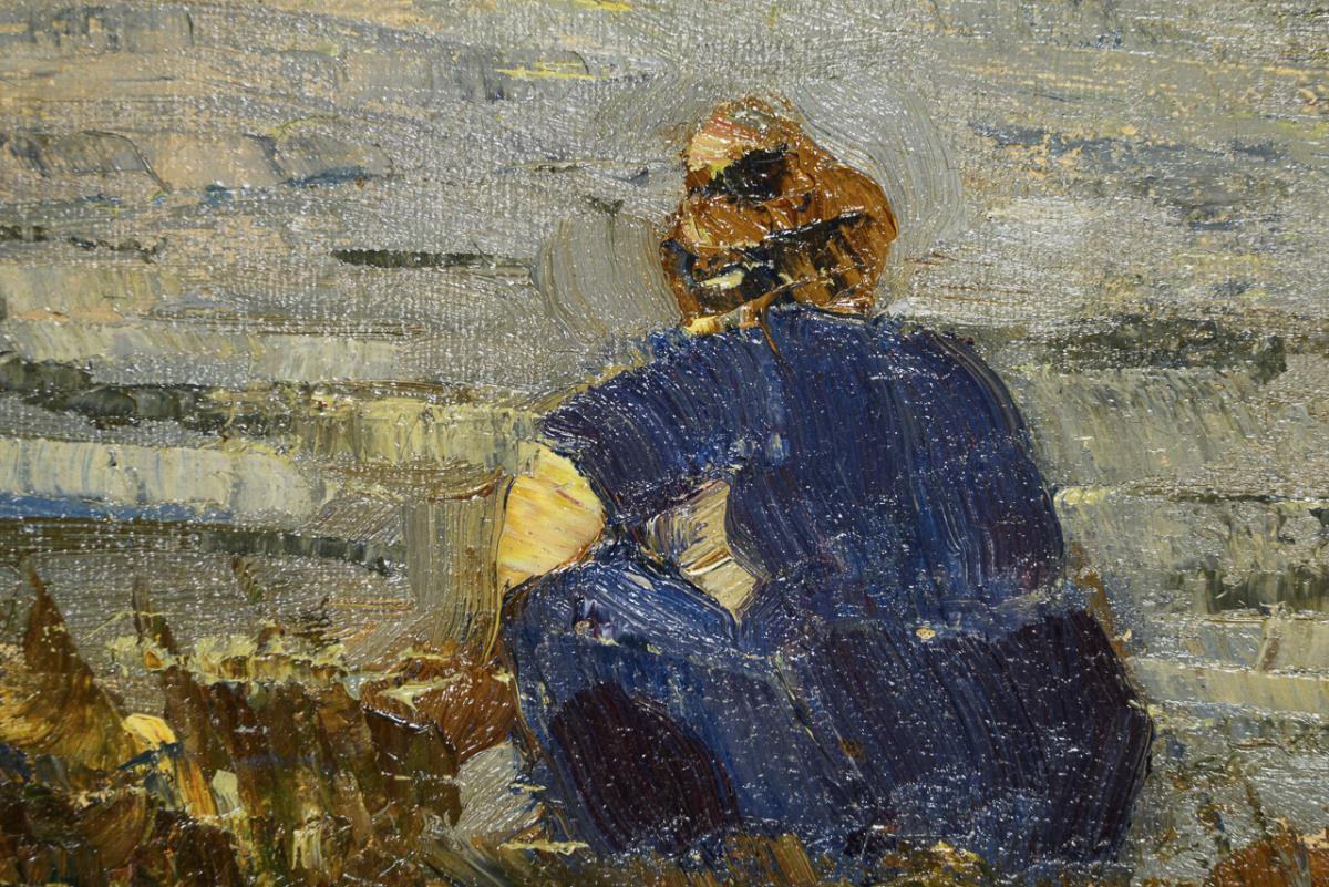 Wohl Wäscherin am Ufer unter wolkigem Himmel.